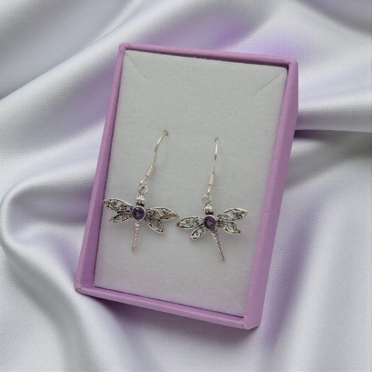 Sterling Silver Dragonfly Amethyst Drop Earrings 1.5"