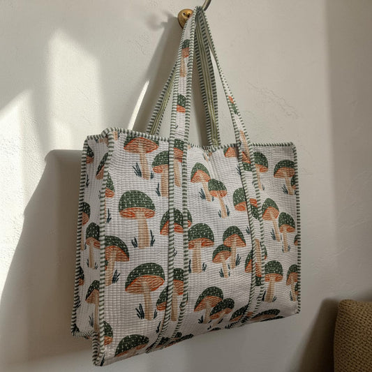 White, Green & Orange Mushroom Print Hand Block Printed Cotton Tote Bag