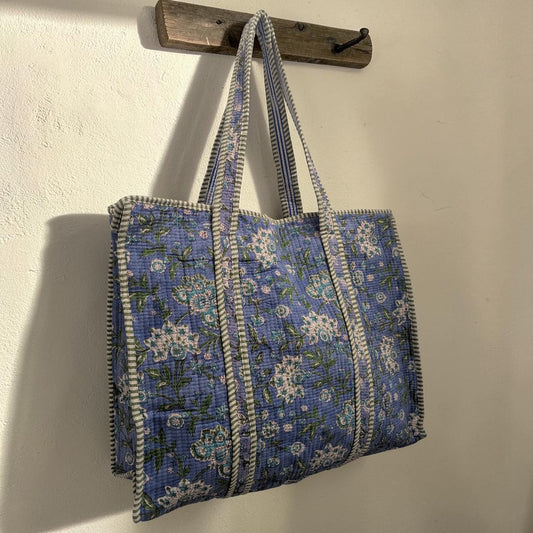 Powder Blue, Green & White Floral Hand Block Printed Cotton Tote Bag