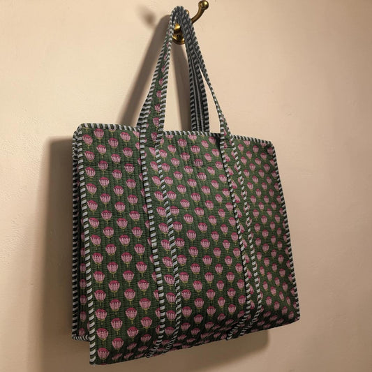 Green & Pink Tulip Print Hand Block Printed Cotton Tote Bag