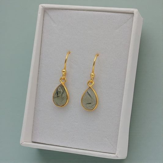 Gold Plated Sterling Silver Emira Teardrop Rutilated Prehnite Drop Earrings 1.1"