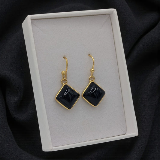 Gold Plated Sterling Silver Emira Diamond Shape Black Onyx Drop Earrings 1.2"