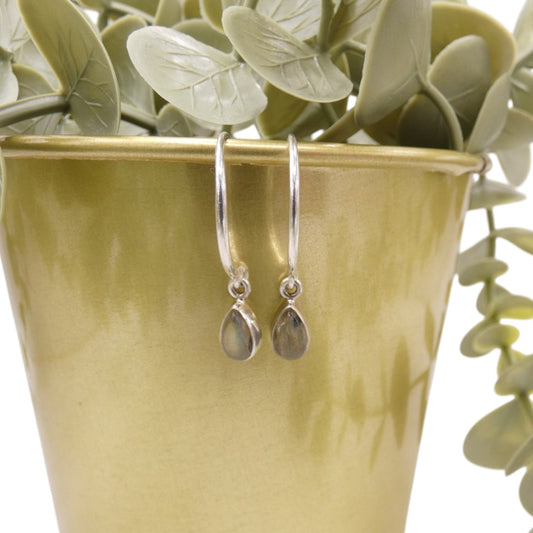 Sterling Silver Labradorite Hoop Earrings With Drop Stone 0.75"
