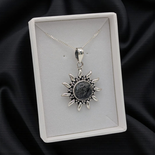 Sterling Silver Emira Black Rutilated Quartz Celestial Sun Necklace
