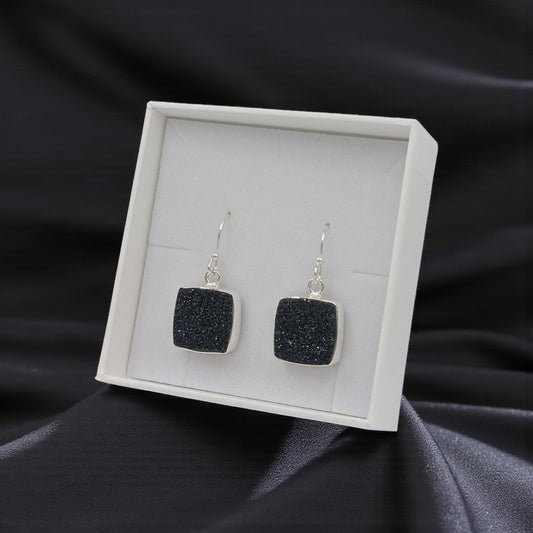 Sterling Silver Black Druzy Square Stone Drop Earrings 1.2"