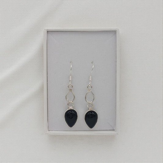 Sterling Silver Black Onyx Love Spoon Design Drop Earrings 1.6"