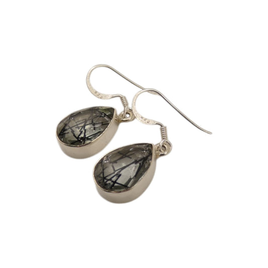 Sterling Silver Black Rutilated Quartz Teardrop Earrings 1.2"
