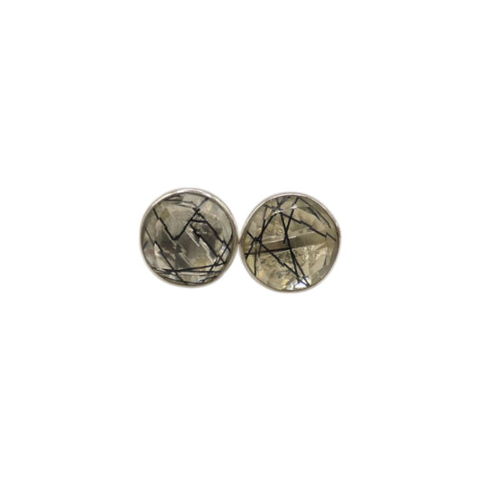 Sterling Silver Black Rutilated Quartz Round Stud Earrings 0.3"