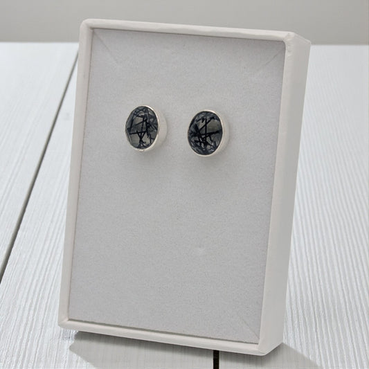 Sterling Silver Emira Black Rutilated Quartz Oval Stud Earrings 0.4"