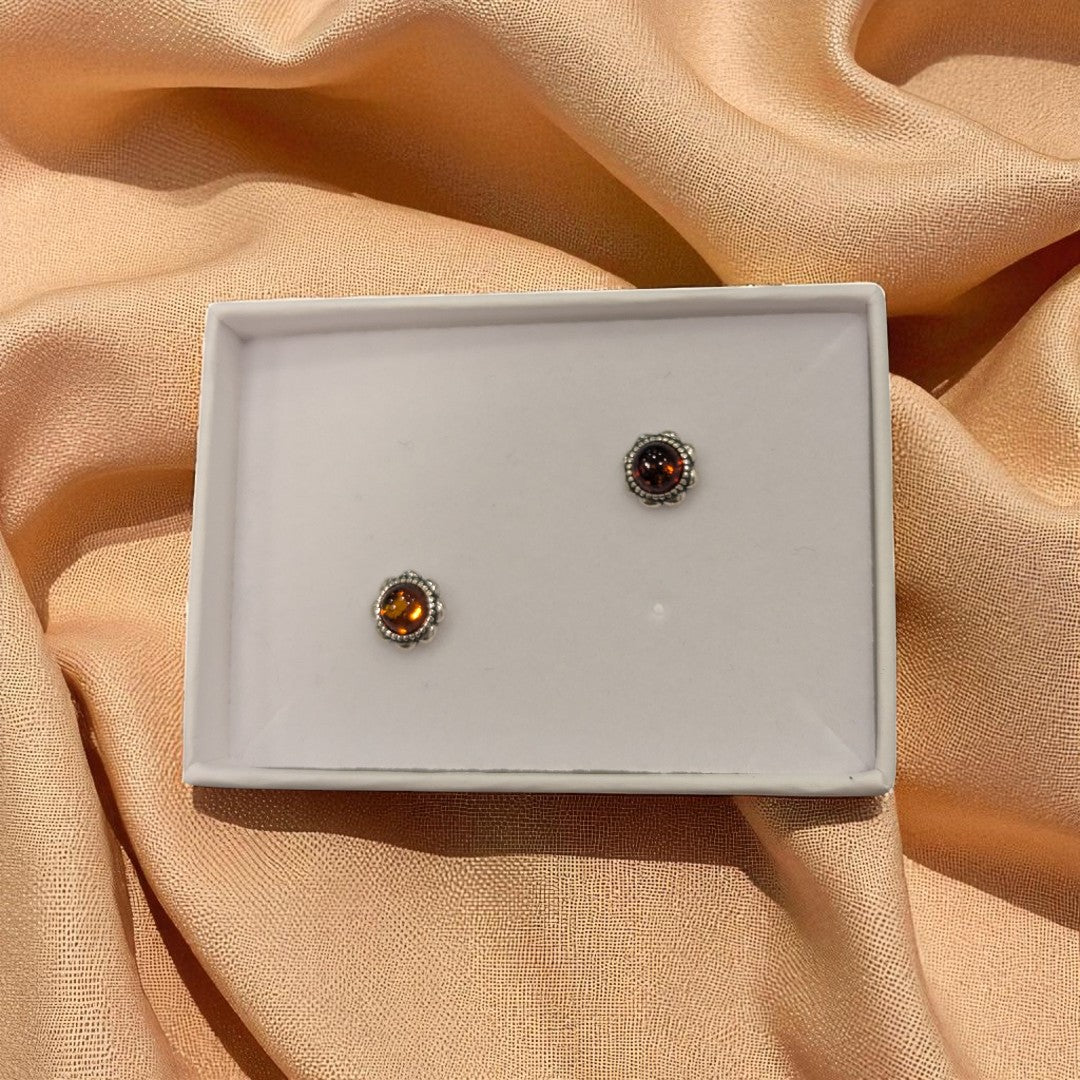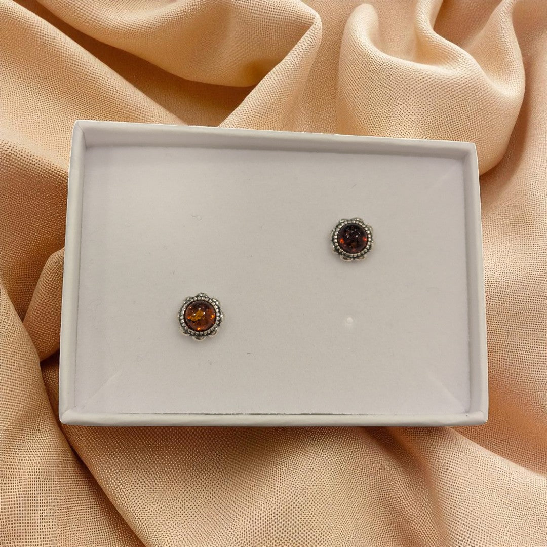 Sterling Silver Baltic Amber Ornate Round Stud Earrings