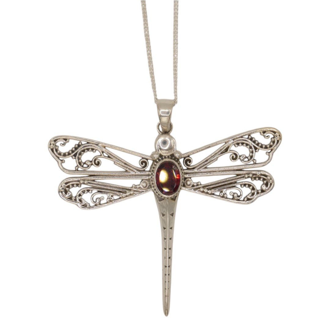 Made with sterling silver, this necklace features a beautiful 1.75 inch garnet pendant in a dragonfly design. The 18 inch sterling silver chain adds a touch of elegance to the overall design, making it a timeless and versatile addition to any jewellery collection. Benefit from the high-quality materials and intricate design of this necklace, perfect for adding a touch of sophistication to any outfit.