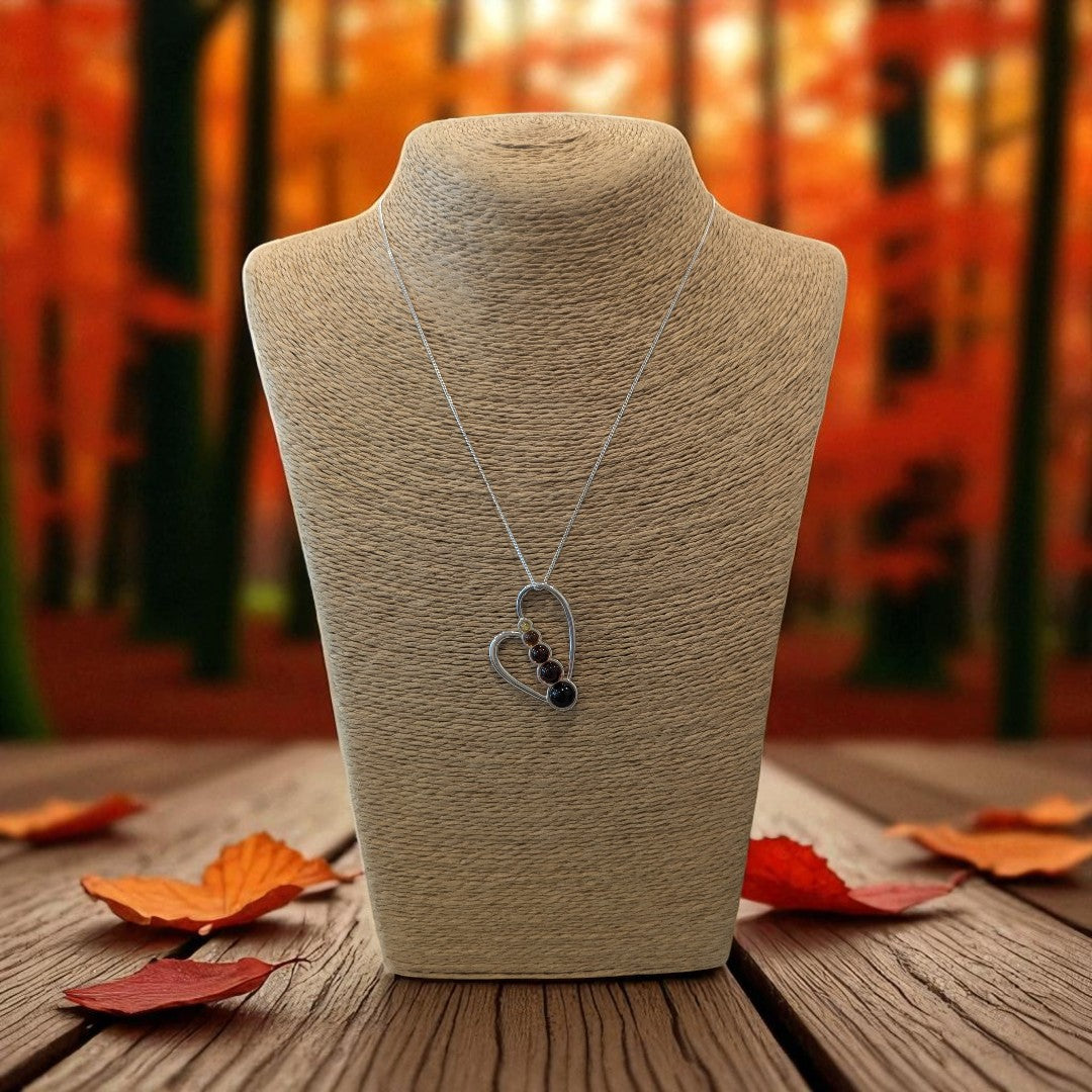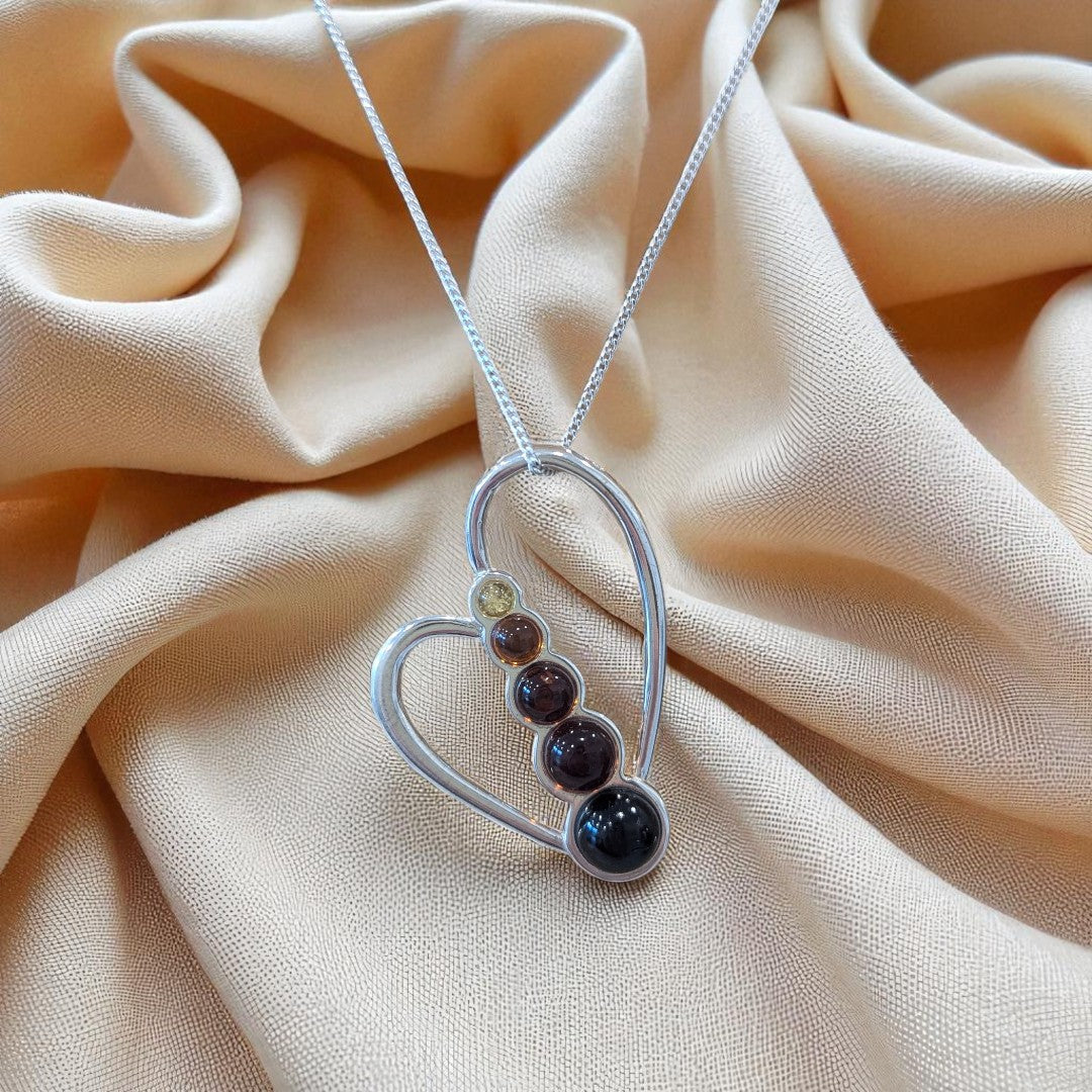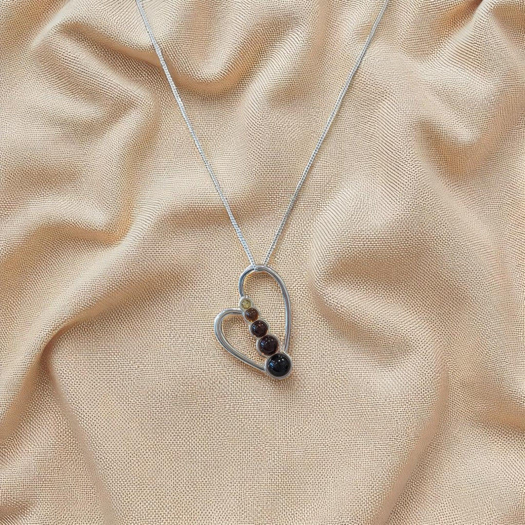 This sterling silver necklace features a multi-amber heart pendant measuring 4cm in height and 2.5cm in width, elegantly suspended from an 18-inch sterling silver chain. The combination of warm amber tones and polished silver creates a timeless piece that complements both casual and formal attire. Crafted with precision, it offers lasting quality and subtle sophistication for everyday wear.
