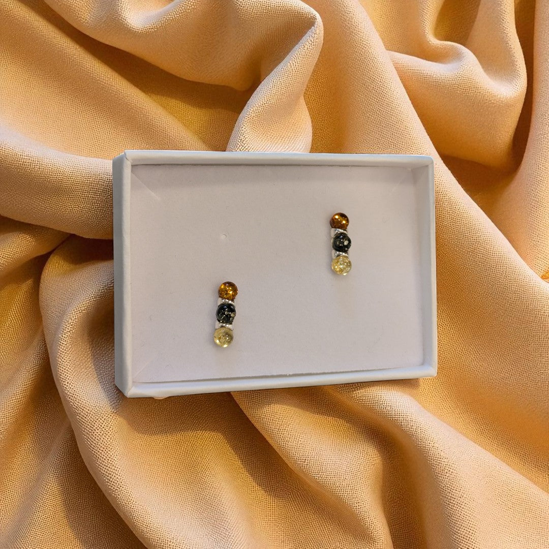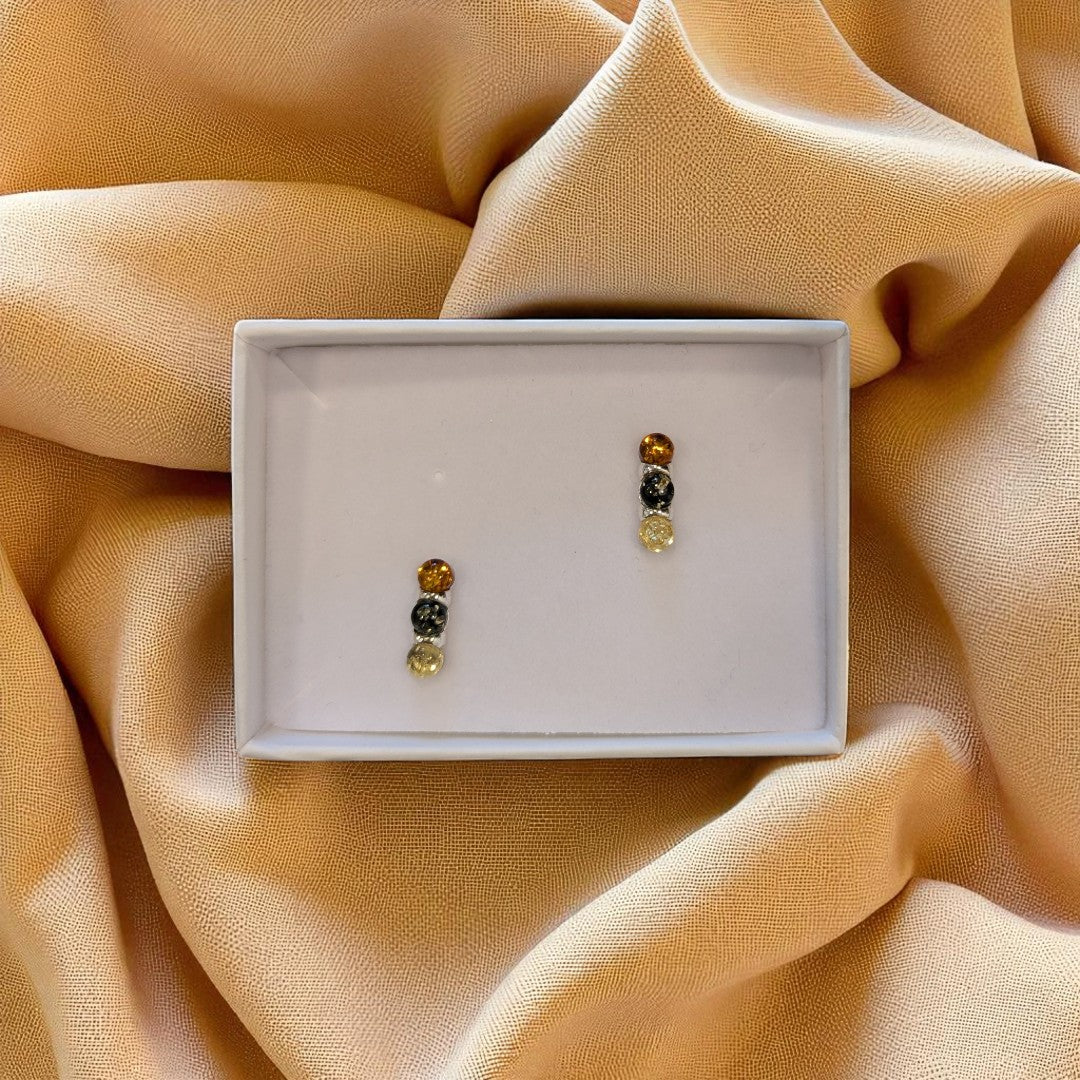 Sterling Silver Tri Coloured Amber Three Stone Stud Earrings